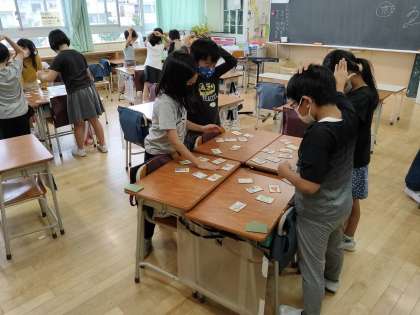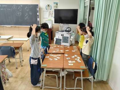 2年生は、昨日から引き続き、国語の言葉遊びに挑戦しています。今日は、かるた遊びを実際にしてみました。手を頭に乗せるなどルールもしっかり守っています。楽しみながら昔の文化、遊びに親しみを持つことができました。