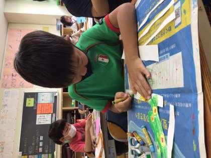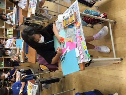 2年生の図工では、「おしゃれなとり」の続きをしています。前回の下地に、鮮やかな飾りをつけています。それぞれ自分のイメージを持ち、楽しそうに取り組んでいました。