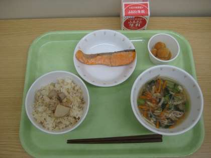 里芋ごはん さけの塩焼き 沢煮椀 月見だんご 牛乳