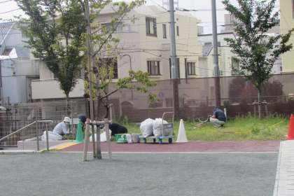 学校主事が校庭周辺の草取りに汗を流しています。体育発表会では保護者観覧ゾーンになるところです。きれいにして、皆さんの来校をお待ちしていますね。