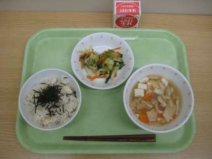 鯛飯 かまぼこ入り和風サラダ 吉野汁 牛乳