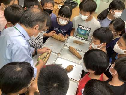 1学期に植えたヘチマが成長して、大きな実をつけました。枯れた実をとってきて、ナイフで切って中身をみる学習をしました。サクサクサクと、まるでフランスパンを切るような美味しそうな音!子供たちの中からは「まって、とりたい!」とタブレットを持ち出す子もいました。
