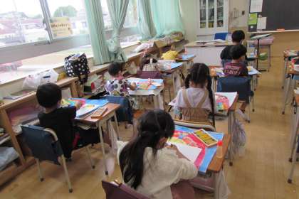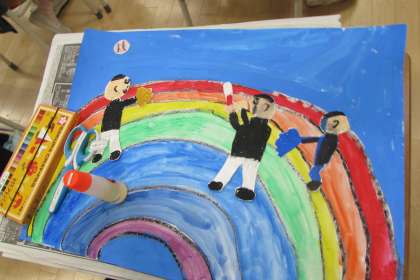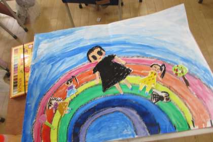 1年生の図工では、絵の具でにじを描き、にじの上でしたいことを思い浮かべながら作品作りを続けています。とっても鮮やかで、楽しい作品ばかりです。だいぶ仕上がってきましたね!完成が楽しみです。