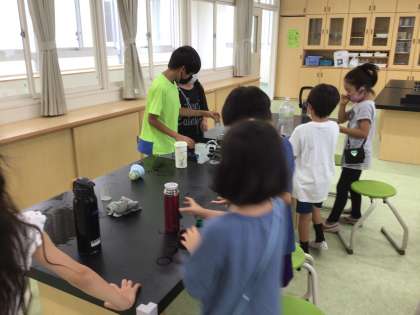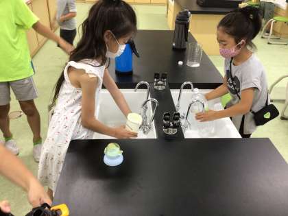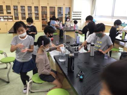 「わたしは6dLだったよ!」や、「ぼくのペットボトルは550mlだった!」と楽しそうでした。自分の普段の生活と結びつけることは、とても大切ですね。初めての理科室、後片付けまで上手にやっていました!