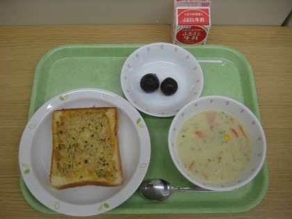ツナトースト クリームスープ 巨峰 牛乳