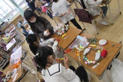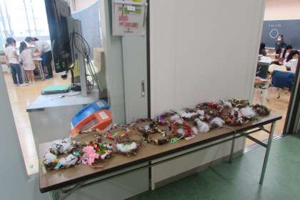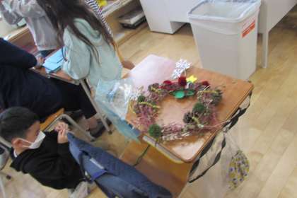 1年生がアサガオのつるを利用してリースを作っています。材料を上手に利用しながら、すてきなリースができあがってきました。少し早いですが、クリスマス気分を味わっています。