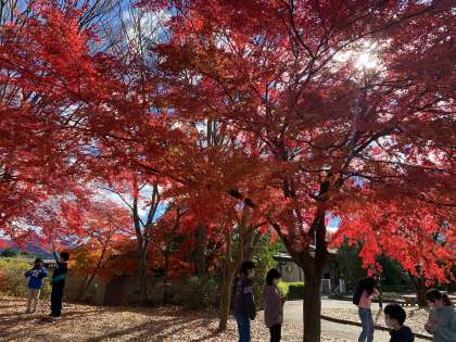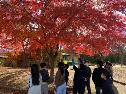 赤城高原SAに到着しました。お手洗い休憩とクラス集合写真を撮影します。紅葉がとても綺麗です。5年生は元気に過ごしています。