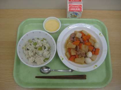 菜めし 豚肉と大根のうま煮 ミルクゼリー 牛乳