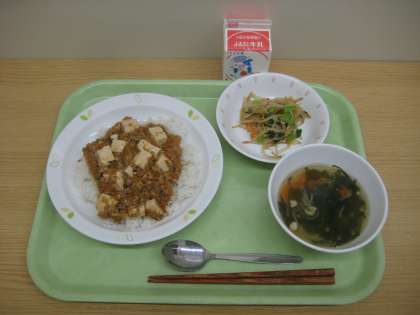 麻婆豆腐丼 ナムル わかめスープ 牛乳