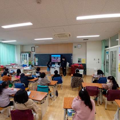 どんぐりやまつぼっくりなどを材料に、作ったおもちゃの発表会をしていました。タブレット端末のスライドには遊び方の動画もあり、見応え十分です。