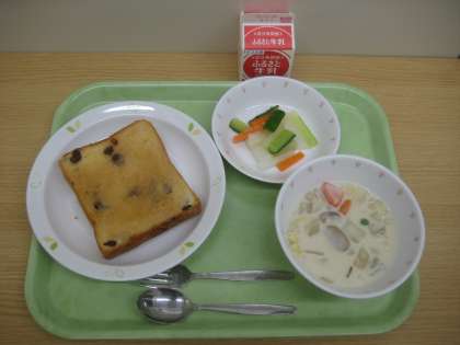 レーズントースト マカロニのクリーム煮 ピクルス 牛乳