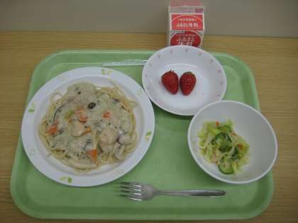 スパゲッティクリームソース ツナサラダ いちご 牛乳