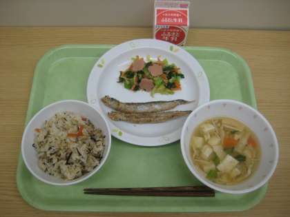 磯ごはん ししゃもの唐揚げ かまぼこ入り和風サラダ 豆腐汁 牛乳
