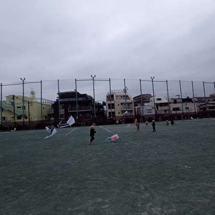 生活科で作った凧をあげていました。校庭中を走り回る子どもたち。色とりどりの凧がきれいですね。