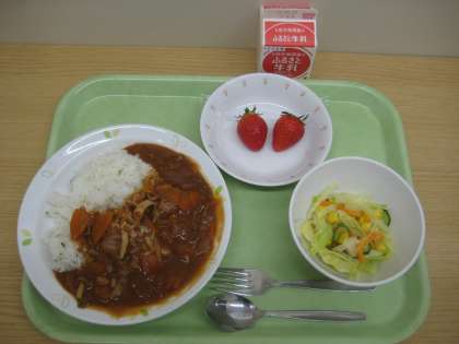 ビーフストロガノフ コーンサラダ いちご 牛乳