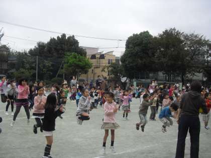 ジャンプしながら手をたたく回数を1回、次は2回・・・と増やしていきます。最後は6回!簡単なようで難しいこの運動に、子どもたちは夢中で取り組んでいました。