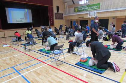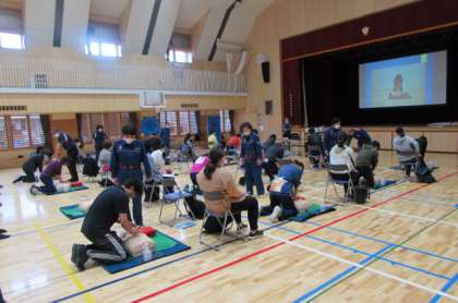 間もなく始まる水泳指導に向け、近隣小学校と合同で救命救急講習会を開催しました。心肺蘇生など、いざというときにも、子どもの安全を守れるよう必要な知識や技能を身に付けます。