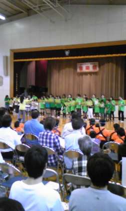 PTAコーラスは、「君をのせて」と「ルージュの伝言」を歌いました。指揮は、大塚先生伴奏は1年生保護者の星野さんでした。子供たちも加わり柔らかい歌声が体育館に響きました。