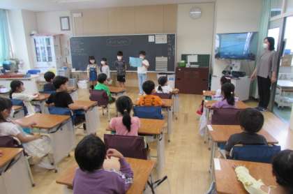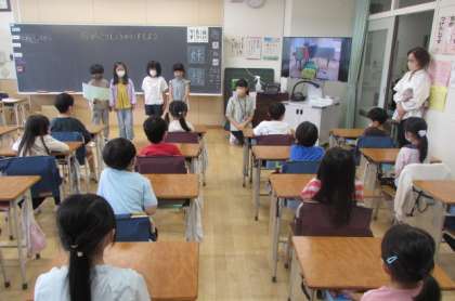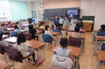 2年生が1年生の教室で学校紹介をしていました。自分たちで写真をとり、原稿を作成して、それぞれの教室や施設を紹介しました。1年生が一生懸命聞いてくれたので、緊張しながらも、達成感を味わうことができたうようです。