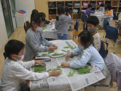 1年生がグリンピースのさやむきのお手伝いをしてくれました。