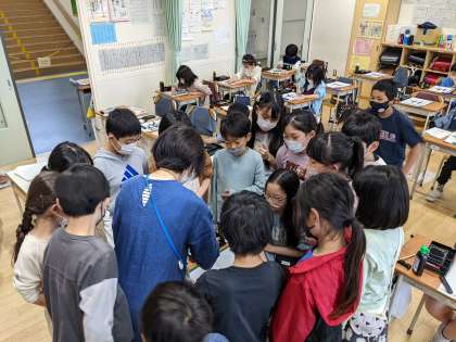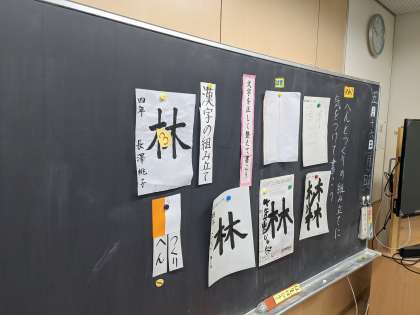 今日は、長澤先生が書写を教えていただきました。練習する字は「林」です。「とめ」「はらい」に注意して、半紙いっぱいに大きく文字書きました。
