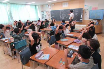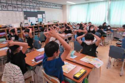 4年生が講師の先生と外国語活動楽しんでいました。曜日をつかったゲームをしているようです。手を頭の上に置いて、この後どうするのかな?