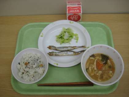 豆わかごはん 焼きししゃも 野菜のひと塩 じゃがいものみそ汁 牛乳
