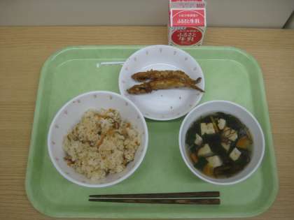 ジューシー ししゃものカレー天ぷら もずくスープ 牛乳