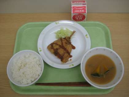 ごはん あじフライ きゃべつ かぼちゃのみそ汁 牛乳