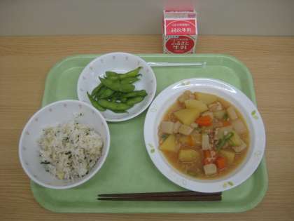 雑穀入りわかめごはん じゃがいものそぼろ煮 枝豆 牛乳