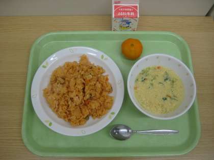 チキンライス 卵とチーズのふわふわスープ 冷凍みかん 牛乳
