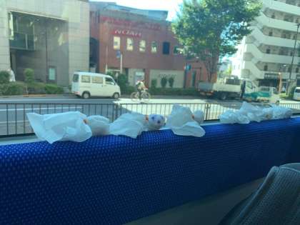 バスの中でてるてる坊主を飾っている男の子がいました。これは晴れること間違いないですね。