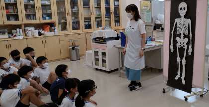 発育測定の前に、保健指導を行いました。体にはたくさん骨があること、その骨を丈夫にするための3つの要素について学びました。