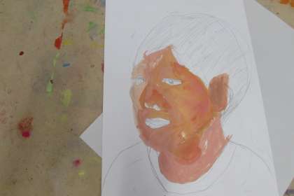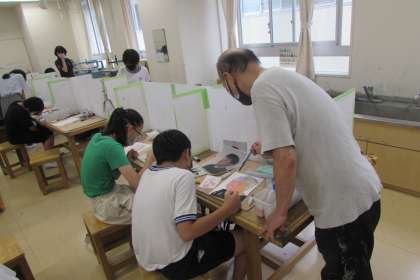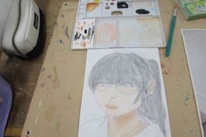 自画像のデッサンがほぼ終わり、ここからは色付けの作業に入ります。顔の凹凸、明暗など色を使い分けていきます。6年生ならではの色使いは、これまでの積み重ねを感じさせますね。
