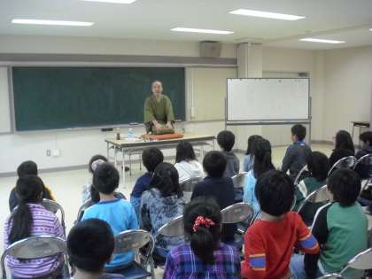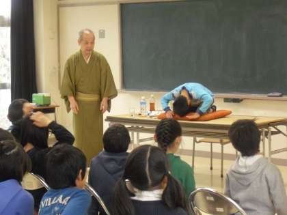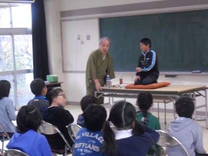 また、落語を聞くだけでなく、正しいあいさつの仕方なども教えていただきました。さらに、4年生による落語の実演もさせていただきました。