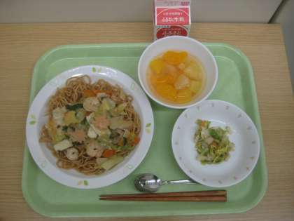五目あんかけそば 辣白菜 フルーツポンチ 牛乳