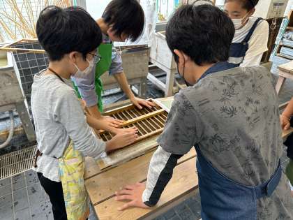 山?小学校伝統工芸室にて、紙漉きを体験してきました。今回漉いた紙は卒業証書となって、卒業式の時に自分のもとに戻ってきます。教えてくださった先生によれば、卒業証書を紙漉きから行っている地域は日本でも世田谷区だけとのこと。印刷は山形県で行います。多くの工程を経て、卒業の証へと形が変わっていくのですね。