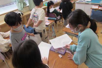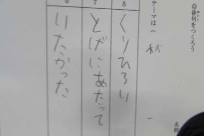 2年生俳句作りに挑戦していました。秋にかかわる言葉(季語)を出し合い、それらをつかって五・七・五のリズムにのせながら作っていきます。傑作がたくさん出てきました。五・七・五で作れる俳句は楽しいね!