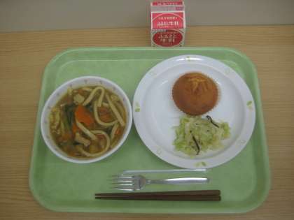 カレーうどん キャベツの塩昆布かけ ぐりとぐらのかすてら 牛乳