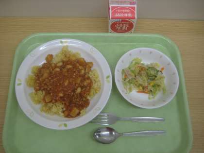 チリビーンズライス げんきサラダ 牛乳