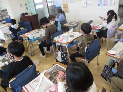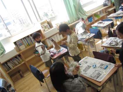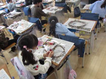 毎年恒例!1年生がアサガオのつるでリースを作っていました。持ってきた材料をつかいながら、楽しい、かわいいリースができあがってきました。廊下に飾られるのが楽しみですね!