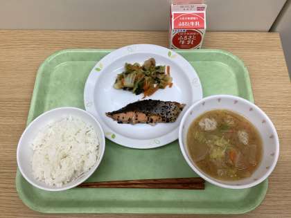 ごはん 鮭の南部焼き 煮浸し 肉団子入りみそ汁 牛乳