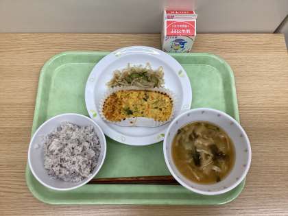 ゆかりごはん 千草焼き ごま酢かけ じゃがいものみそ汁 牛乳