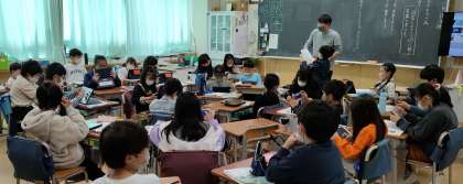 個人でまず考え、次にグループ、そして最後の全体共有では、みんなで中央を向いてぐるぐる巻きで話し合いをします。新しい共有方法を実践しています。