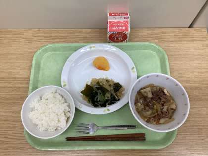 ごはん 芋煮 じゃこサラダ 柿 牛乳