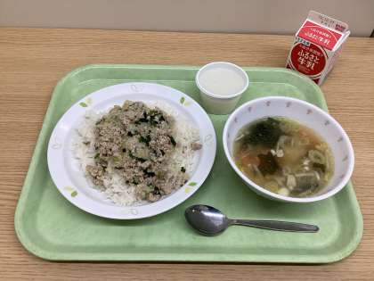 ぎょうざ丼 わかめスープ ホワイトゼリー 牛乳