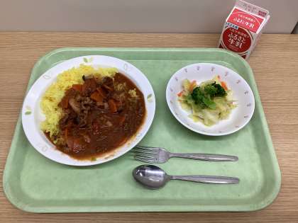 ビーフストロガノフ ブロッコリーのサラダ 牛乳