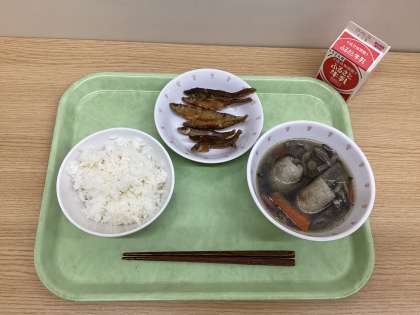 ごはん わかさぎの唐揚げ きりたんぽ汁 牛乳