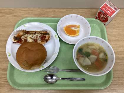 ぶどうパン 魚のピザ風 かぶのスープ デコポン 牛乳