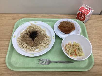 おろしスパゲッティ みそドレッシングサラダ チョコレートチーズケーキ 牛乳